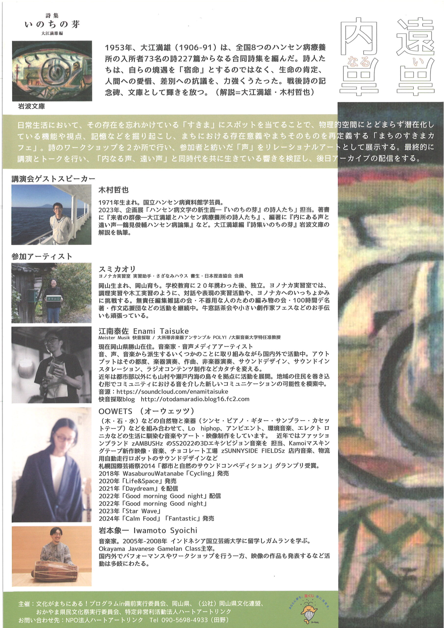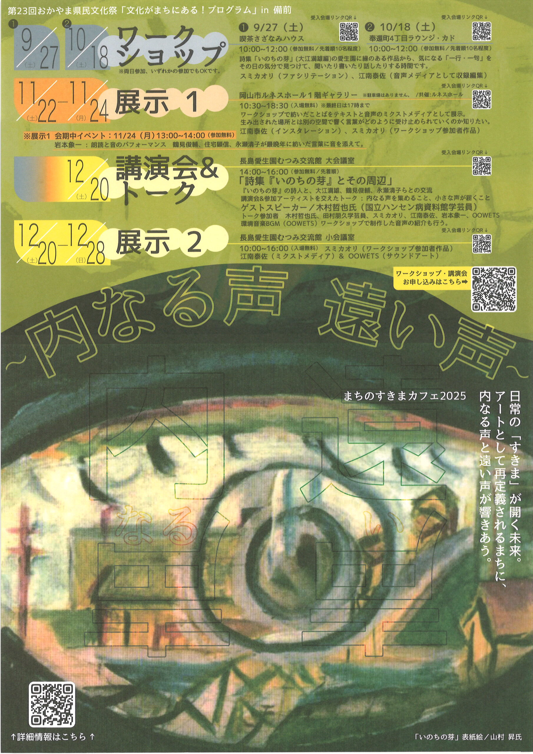 ワークショップで紡いだことばをテキストと音声のミクストメディアとして展示。 江南 泰佐 (インスタレーション) スミ カオリ(ワークショップ参加者作品) 【会期中イベント】 11月24日(月)13:00~14:00 参加無料 岩本象一:朗読と音のパフォーマンス 鶴見俊輔、住宅顕信、永瀬清子が最晩年に紡いだ言葉に音を添えて |