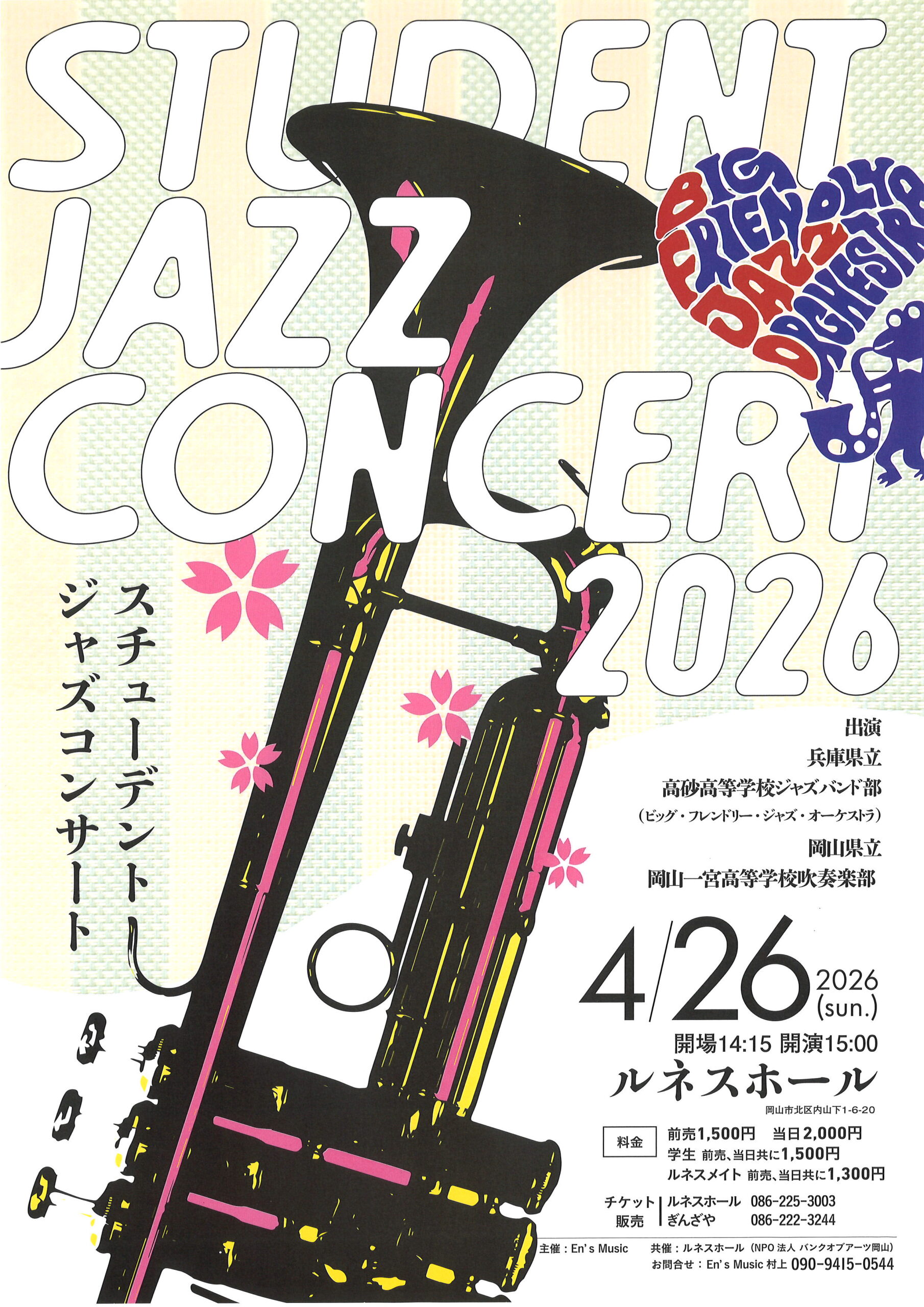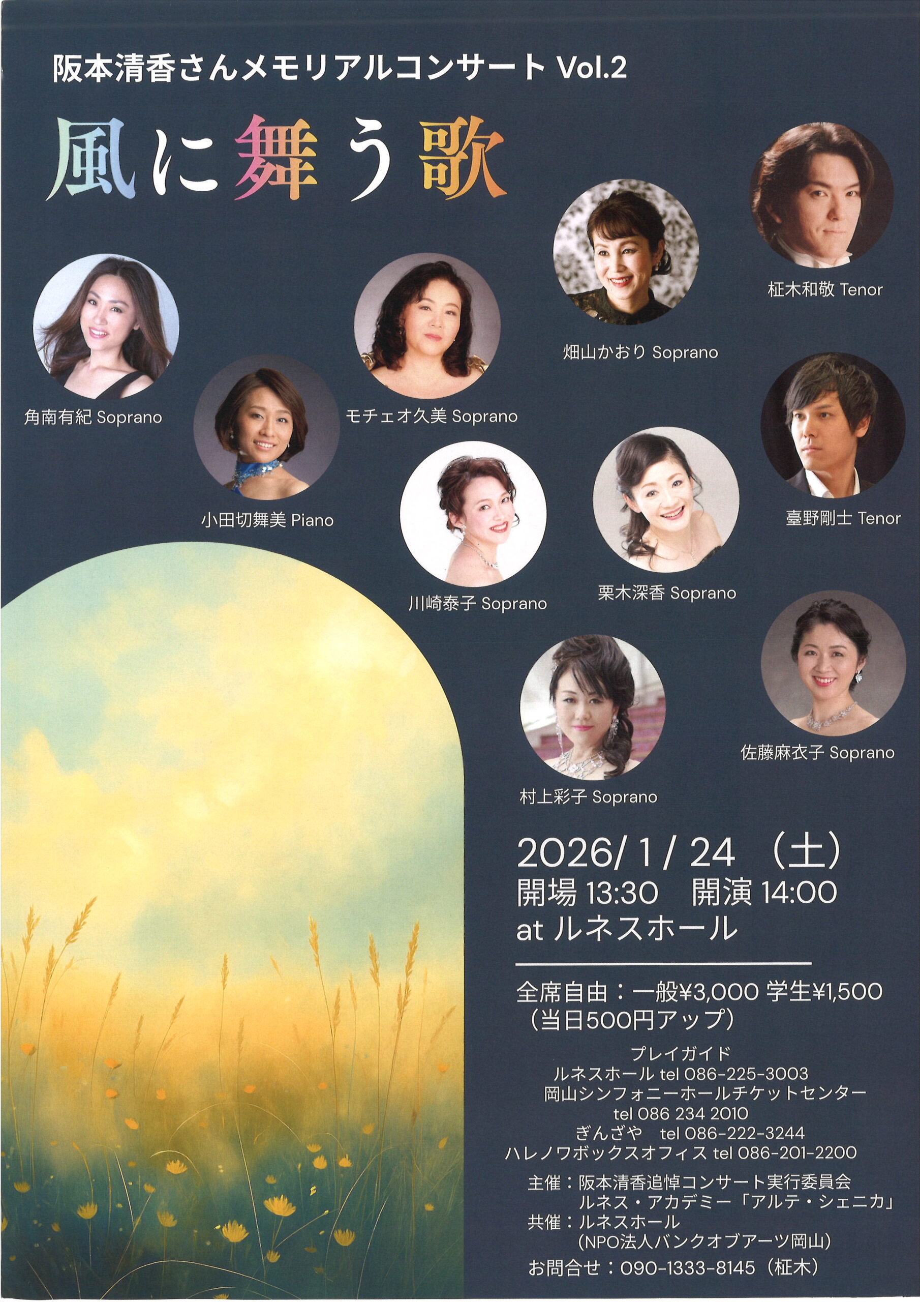 一般 前売当日共 1,500円 中学生以下 無料 (全席自由席) <チケット取り扱い> ・ルネスホール Tel:086-225-3003 |