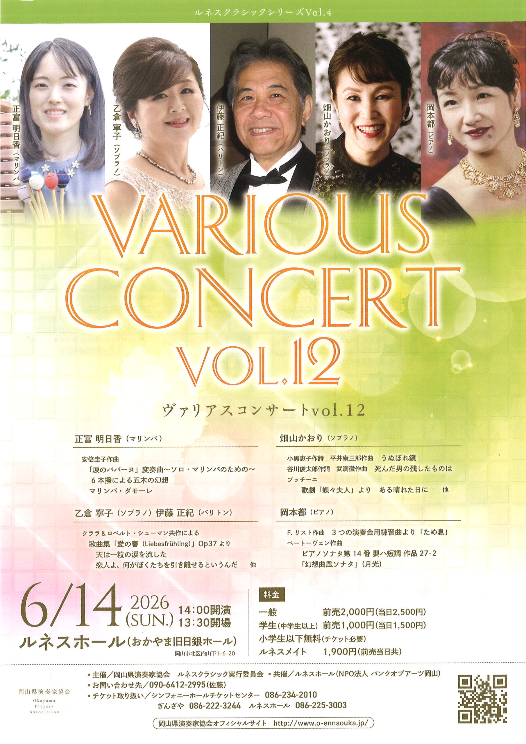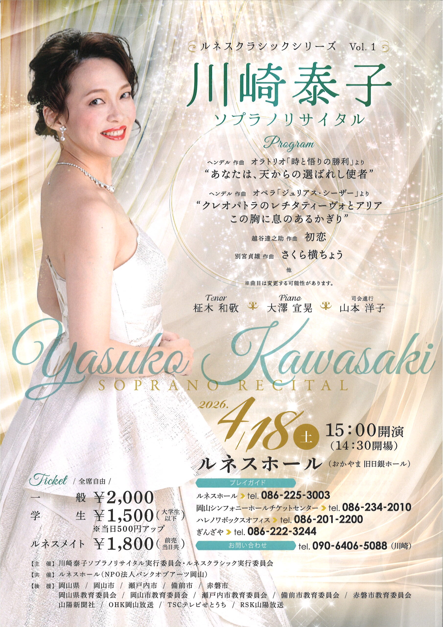 一般 前売 3,000円 一般 当日 3,500円 学生 前売当日共 2,000円 小学生以下 前売当日共 500円 ルネスメイト 前売 2,700円 ルネスメイト 当日 3,150円 (全席自由席) <チケット取り扱い> ・岡山シンフォニーホールチケットセンター Tel:086-234-2010 ・ぎんざや Tel:086-222-3244 ・ルネスホール Tel:086-225-3003 |