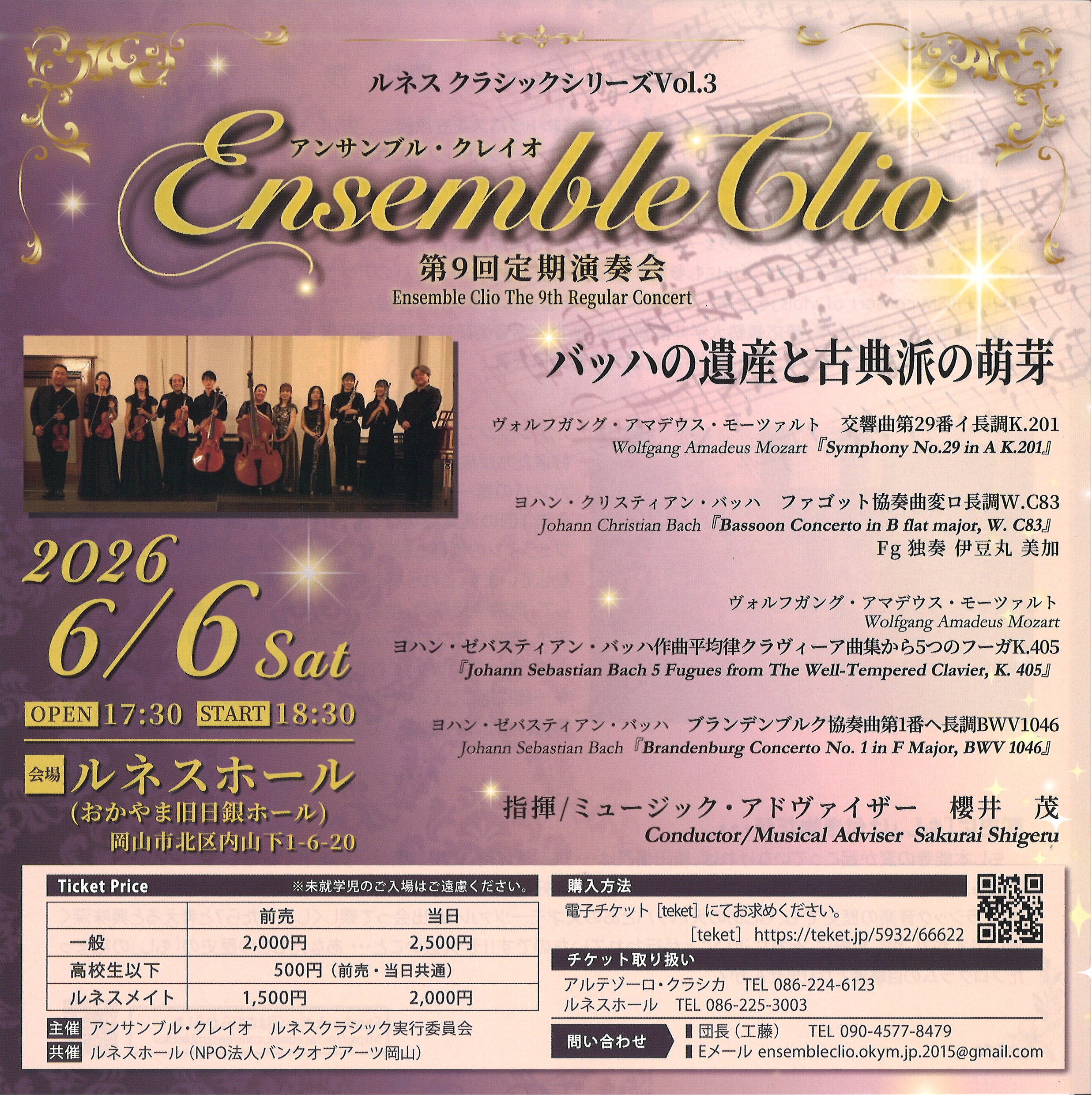 一般 前売 2,000円 一般 当日 2,500円 高校生以下 前売当日共 500円 ルネスメイト 前売 1,500円 ルネスメイト 当日 2,000円 (全席自由席) ※未就学児のご入場はご遠慮ください <チケット取り扱い> ・アルテゾーロ・クラシカ Tel:086-224-6123 ・ルネスホール Tel:086-225-3003 ・電子チケット「teket」 https://teket.jp/5932/66622 |
