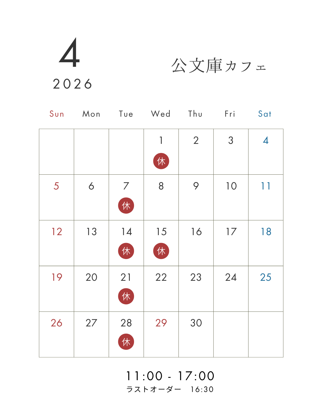 公文庫カフェ営業日のお知らせ(4月)